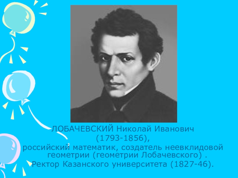 ЛОБАЧЕВСКИЙ Николай Иванович (1793-1856),российский математик, создатель неевклидовой геометрии (геометрии Лобачевского) . Ректор Казанского университета (1827-46).