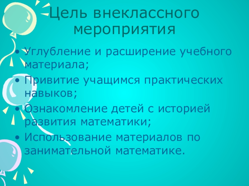 Цель внеклассного мероприятияУглубление и расширение учебного материала;Привитие учащимся практических навыков;Ознакомление детей с историей развития математики;Использование материалов по занимательной математике.