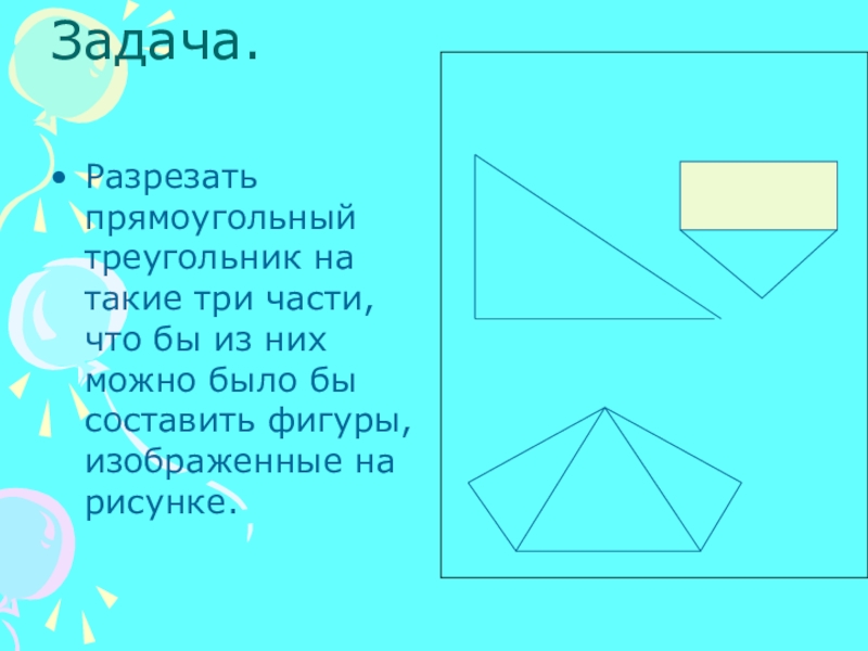 Задача.Разрезать прямоугольный треугольник на такие три части, что бы из них можно было бы составить фигуры, изображенные