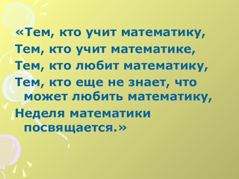 «Тем, кто учит математику,Тем, кто учит математике,Тем, кто любит математику,Тем, кто еще не знает, что может любить