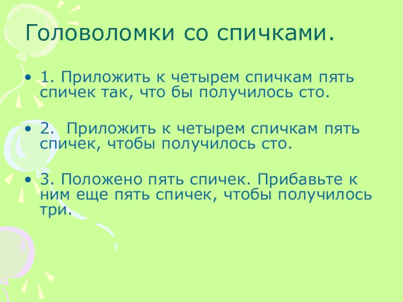 Головоломки со спичками.1. Приложить к четырем спичкам пять спичек так, что бы получилось сто.2. Приложить к четырем