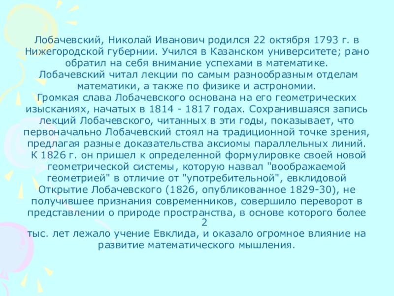 Лобачевский, Николай Иванович родился 22 октября 1793 г. вНижегородской губернии. Учился в Казанском университете; ранообратил на себя