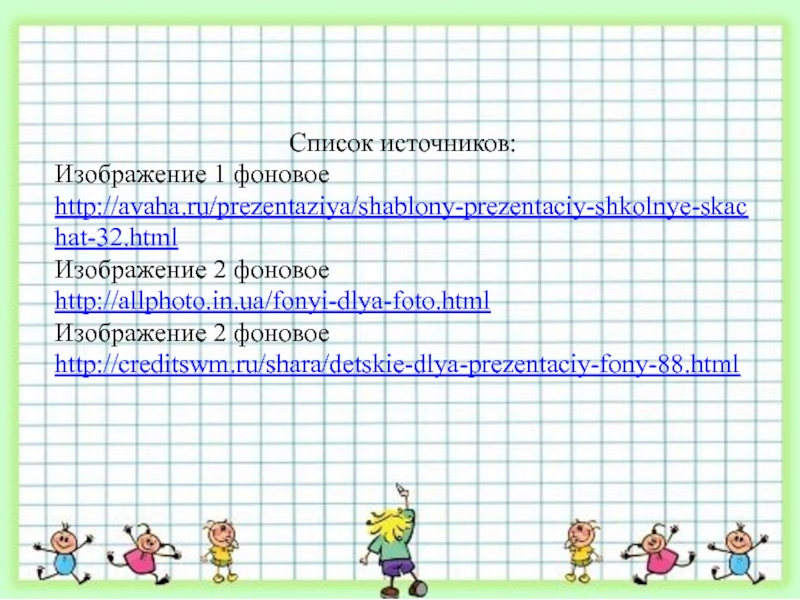 Список источников:Изображение 1 фоновое http://avaha.ru/prezentaziya/shablony-prezentaciy-shkolnye-skachat-32.htmlИзображение 2 фоновое http://allphoto.in.ua/fonyi-dlya-foto.htmlИзображение 2 фоновое http://creditswm.ru/shara/detskie-dlya-prezentaciy-fony-88.html