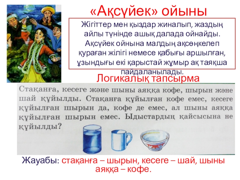 Жауабы: стақанға – шырын, кесеге – шай, шыны аяққа – кофе.