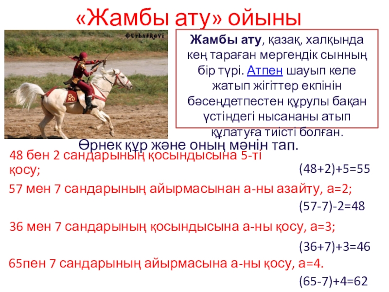 65пен 7 сандарының айырмасына а-ны қосу, а=4.