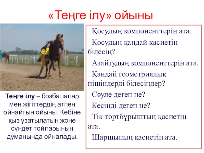 Теңге ілу – бозбалалар мен жігіттердің атпен ойнайтын ойыны. Көбіне қыз ұзатылатын және сүндет тойларының думанында ойналады.