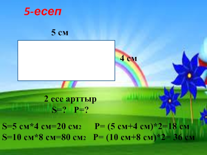 S=5 cм*4 см=20 см2 Р= (5 см+4 см)*2=18 см
