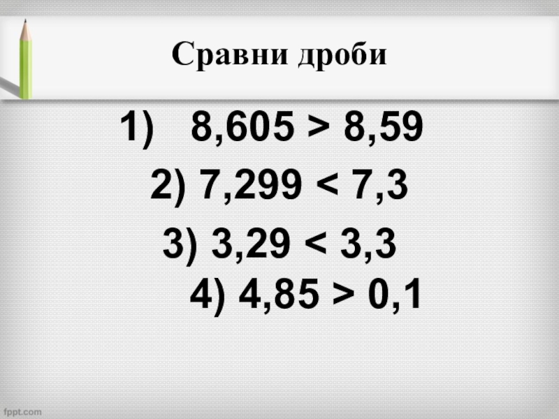 Сравни дроби8,605 > 8,59          2) 7,299 < 7,33)