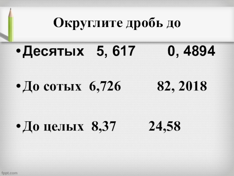 Округлите дробь доДесятых  5, 617    0, 4894До сотых 6,726