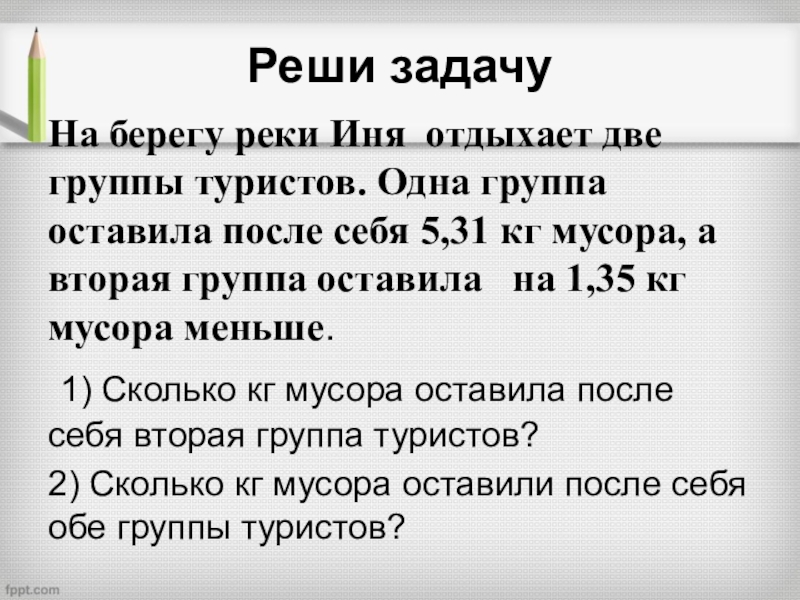 Реши задачуНа берегу реки Иня отдыхает две группы туристов. Одна группа оставила после себя 5,31 кг мусора,