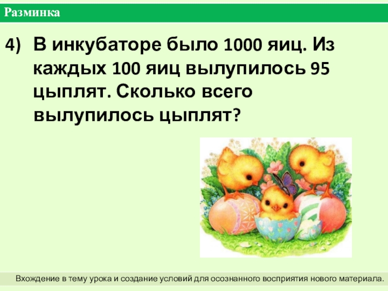 В инкубаторе было 1000 яиц. Из каждых 100 яиц вылупилось 95 цыплят. Сколько всего вылупилось цыплят?