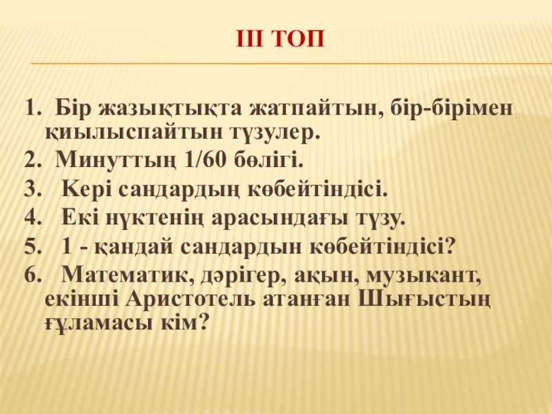 ІІІ топ 1. Бір жазықтықта жатпайтын, бір-бірімен қиылыспайтын түзулер. 2. Минуттың 1/60 бөлігі. 3.  Kepi сандардың