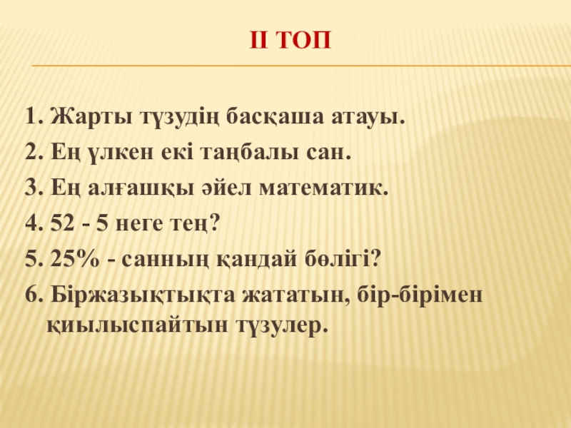 II топ 1. Жарты түзудің басқаша атауы.2. Ең үлкен екі таңбалы сан. 3. Ең алғашқы әйел математик. 4.