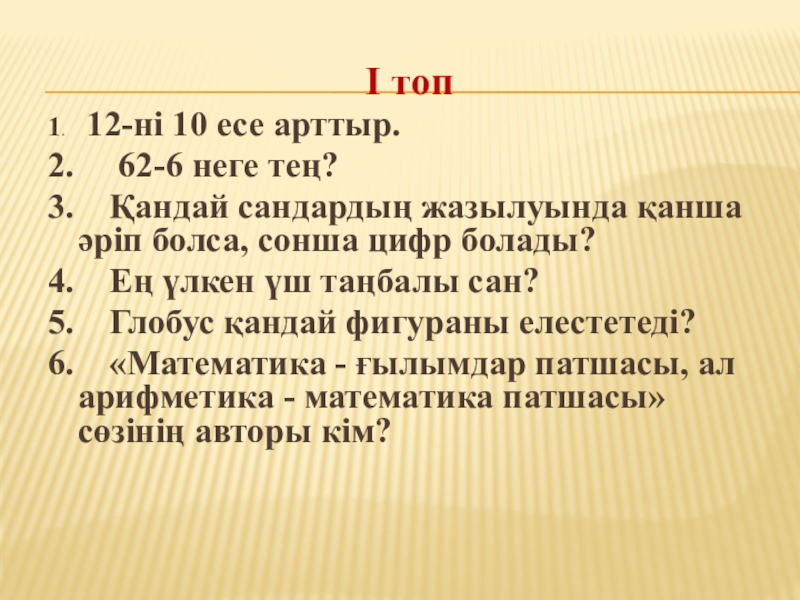 I топ1.   12-ні 10 есе арттыр. 2.   62-6 неге тең? 3.  Қандай сандардың