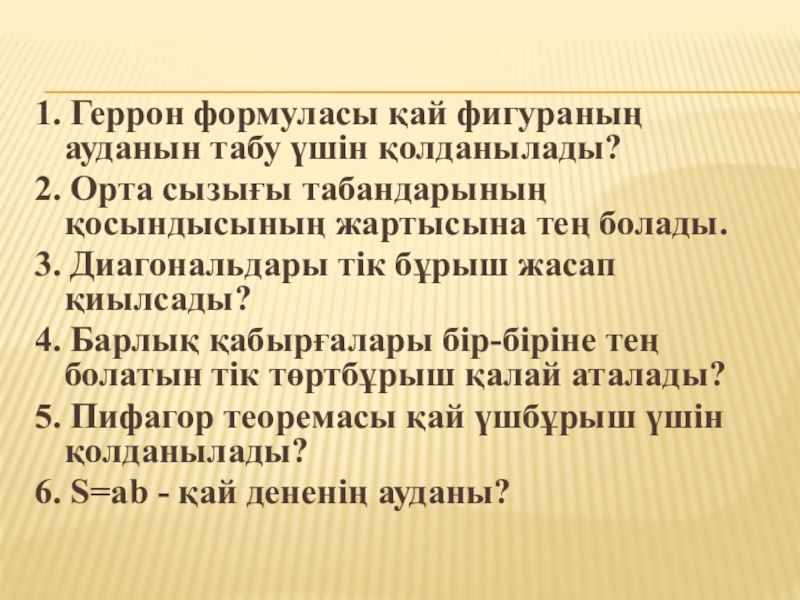 1. Геррон формуласы қай фигураның ауданын табу үшін қолданылады? 2. Орта сызығы табандарының қосындысының жартысына тең болады.