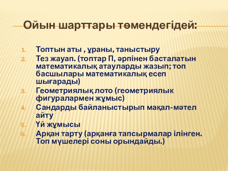 Ойын шарттары төмендегідей:Топтын аты , ұраны, таныстыруТез жауап. (топтар П, әрпінен басталатын математикалық атауларды жазып; топ басшылары
