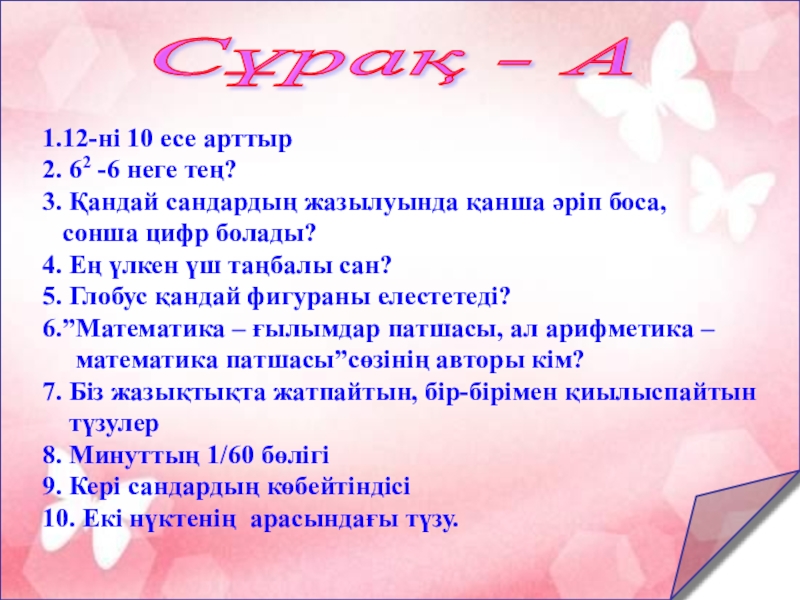 Сұрақ - А 1.12-ні 10 есе арттыр2. 62 -6 неге тең?3. Қандай сандардың жазылуында қанша әріп боса,