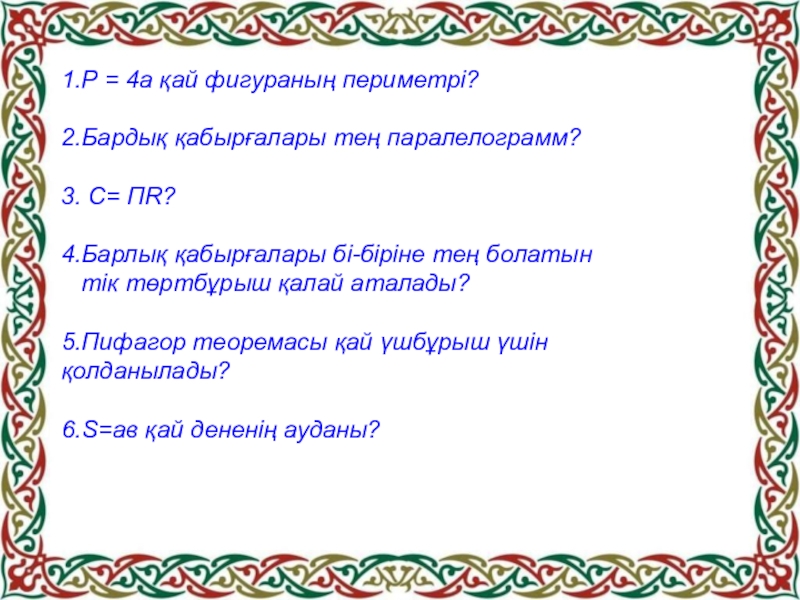 1.Р = 4a қай фигураның периметрі?2.Бардық қабырғалары тең паралелограмм?3. C= ПR?4.Барлық қабырғалары бі-біріне тең болатын  тік