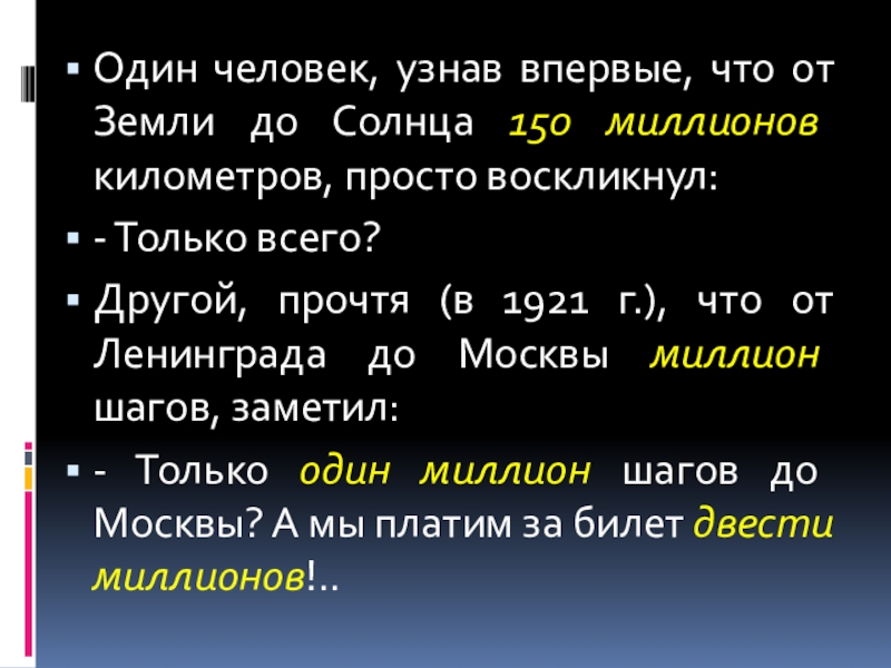 Один человек, узнав впервые, что от Земли до Солнца 150 миллионов