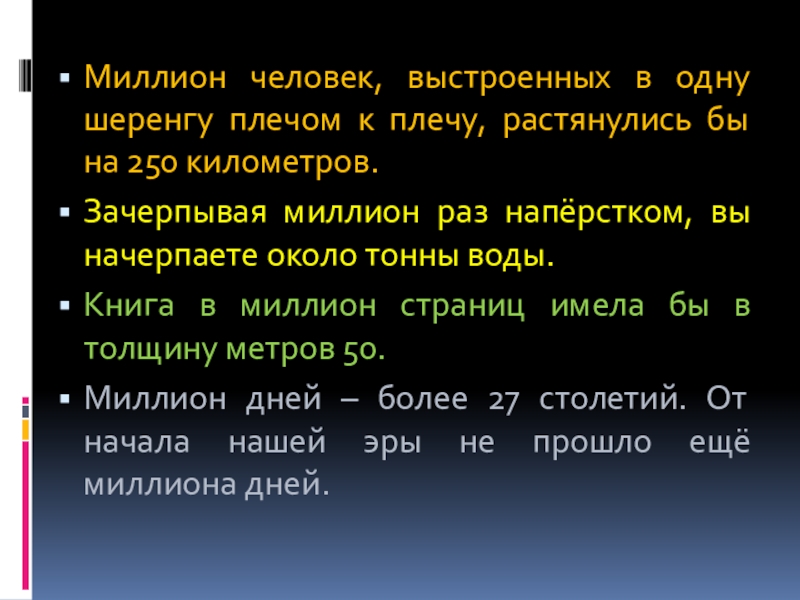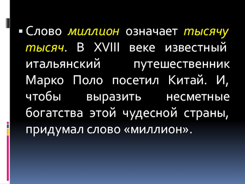 Слово миллион означает тысячу тысяч. В XVIII веке известный итальянский путешественник