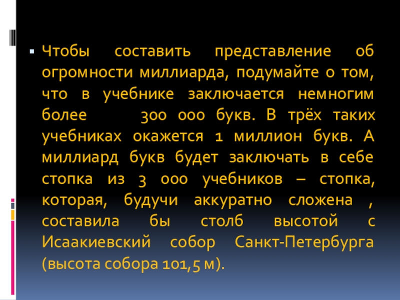 учебнике заключается немногим более 300 000 букв. В трёх таких учебниках окажется 1 миллион букв. А миллиард букв будет заключать в себе стопка из 3 000 учебников – стопка, которая, будучи аккуратно сложена , составила бы столб высотой с Исаакиевский собор Санкт-Петербурга (высота собора 101,5 м).