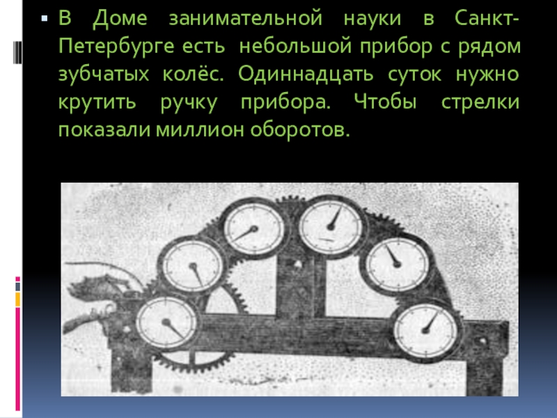 зубчатых колёс. Одиннадцать суток нужно крутить ручку прибора. Чтобы стрелки показали миллион оборотов.