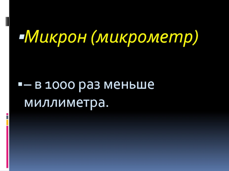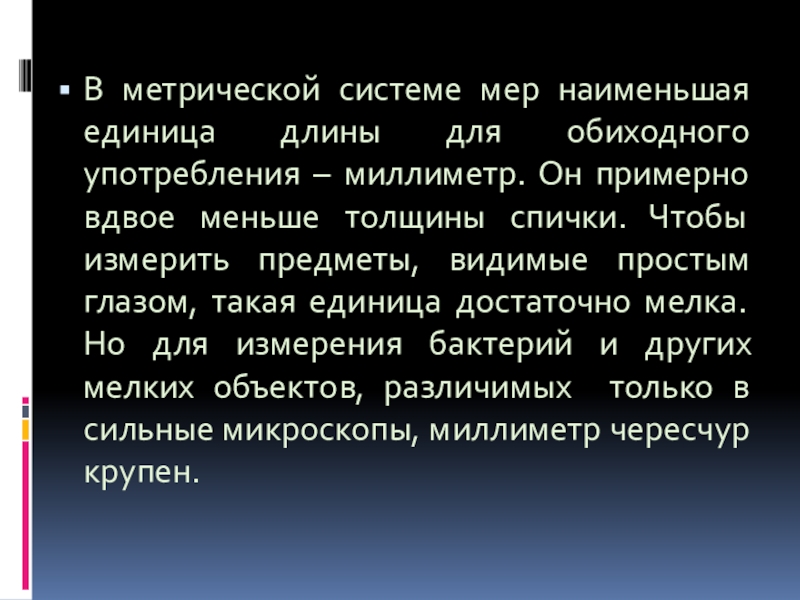 миллиметр. Он примерно вдвое меньше толщины спички. Чтобы измерить предметы, видимые простым глазом, такая единица достаточно мелка. Но для измерения бактерий и других мелких объектов, различимых только в сильные микроскопы, миллиметр чересчур крупен.