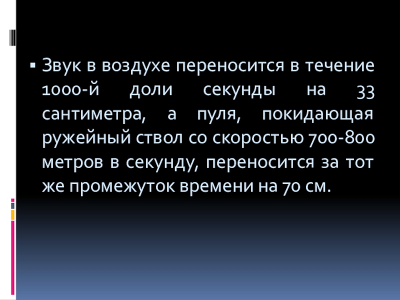 сантиметра, а пуля, покидающая ружейный ствол со скоростью 700-800 метров в секунду, переносится за тот же промежуток времени на 70 см.