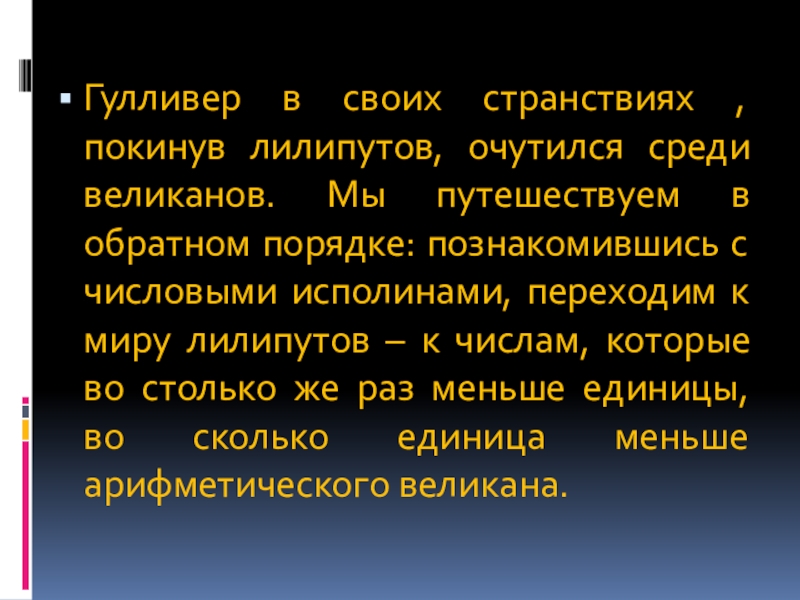 путешествуем в обратном порядке: познакомившись с числовыми исполинами, переходим к миру лилипутов – к числам, которые во столько же раз меньше единицы, во сколько единица меньше арифметического великана.