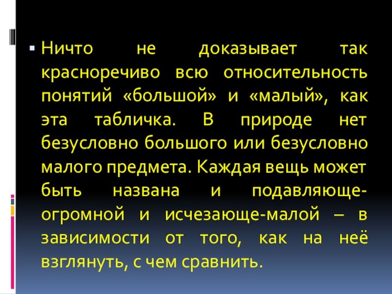 как эта табличка. В природе нет безусловно большого или безусловно малого предмета. Каждая вещь может быть названа и подавляюще-огромной и исчезающе-малой – в зависимости от того, как на неё взглянуть, с чем сравнить.