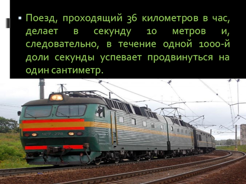 Поезд, проходящий 36 километров в час, делает в секунду 10 метров