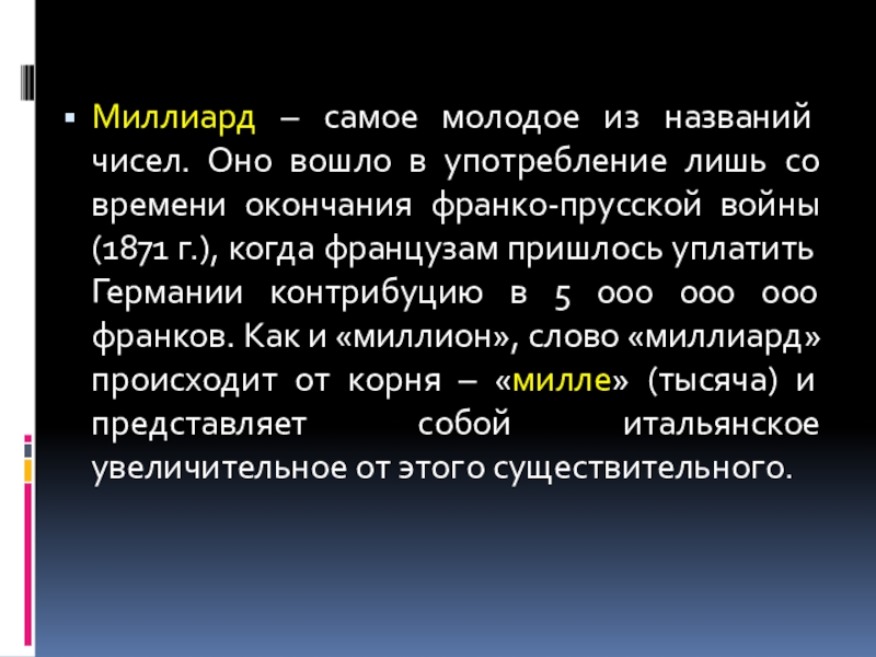лишь со времени окончания франко-прусской войны (1871 г.), когда французам пришлось уплатить Германии контрибуцию в 5 000 000 000 франков. Как и «миллион», слово «миллиард» происходит от корня – «милле» (тысяча) и представляет собой итальянское увеличительное от этого существительного.