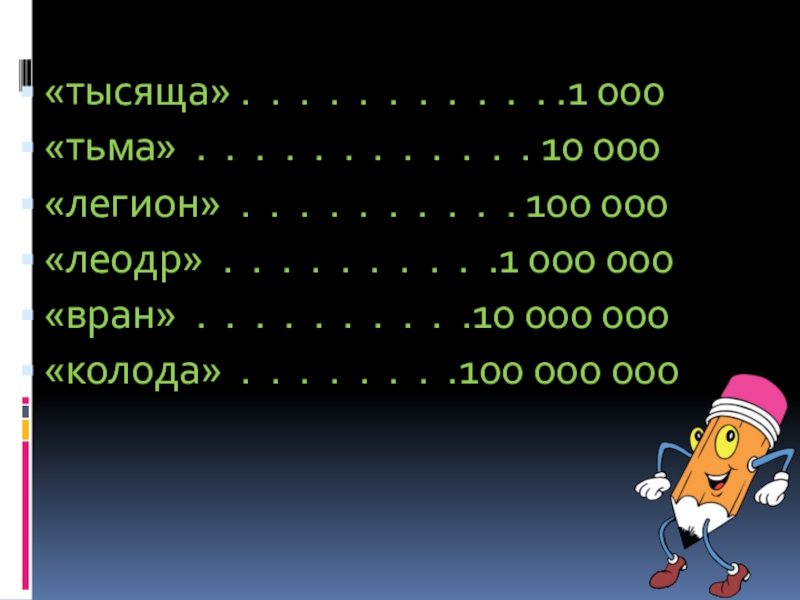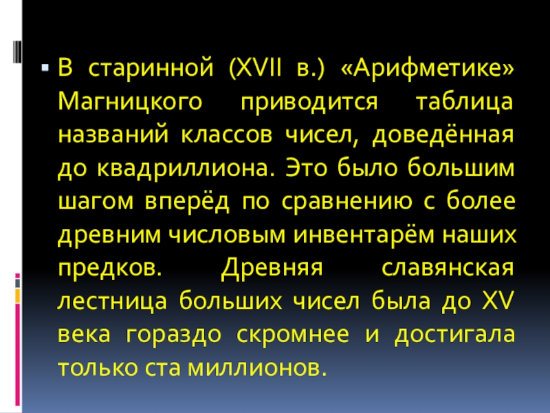 доведённая до квадриллиона. Это было большим шагом вперёд по сравнению с более древним числовым инвентарём наших предков. Древняя славянская лестница больших чисел была до XV века гораздо скромнее и достигала только ста миллионов.