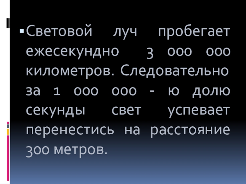 000 000 - ю долю секунды свет успевает перенестись на расстояние 300 метров.