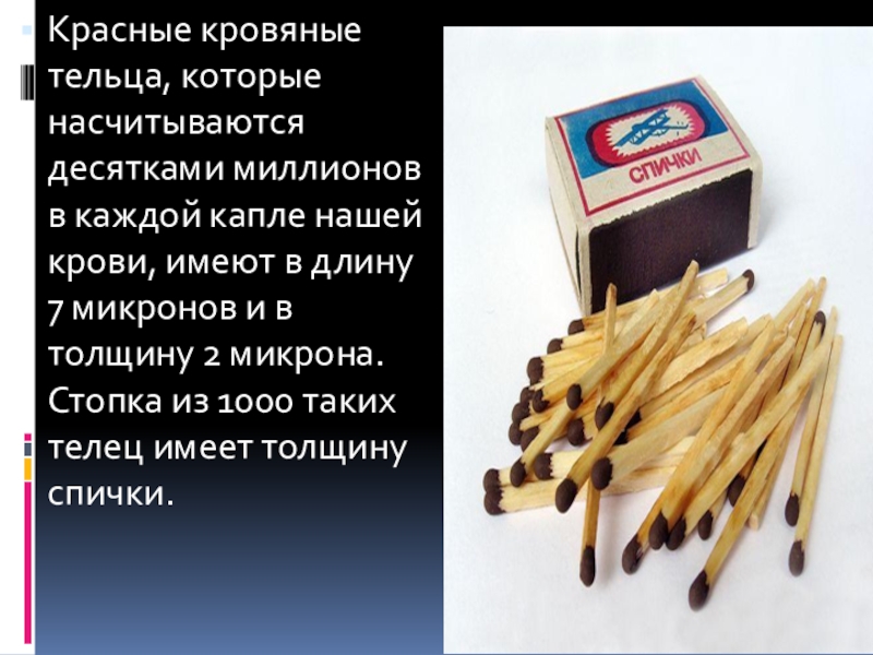 крови, имеют в длину 7 микронов и в толщину 2 микрона. Стопка из 1000 таких телец имеет толщину спички.