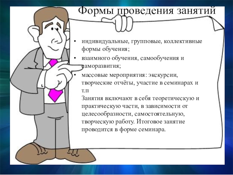 Занятия включают в себя теоретическую и практическую части, в зависимости от целесообразности, самостоятельную, творческую работу. Итоговое занятие проводится в форме семинара.