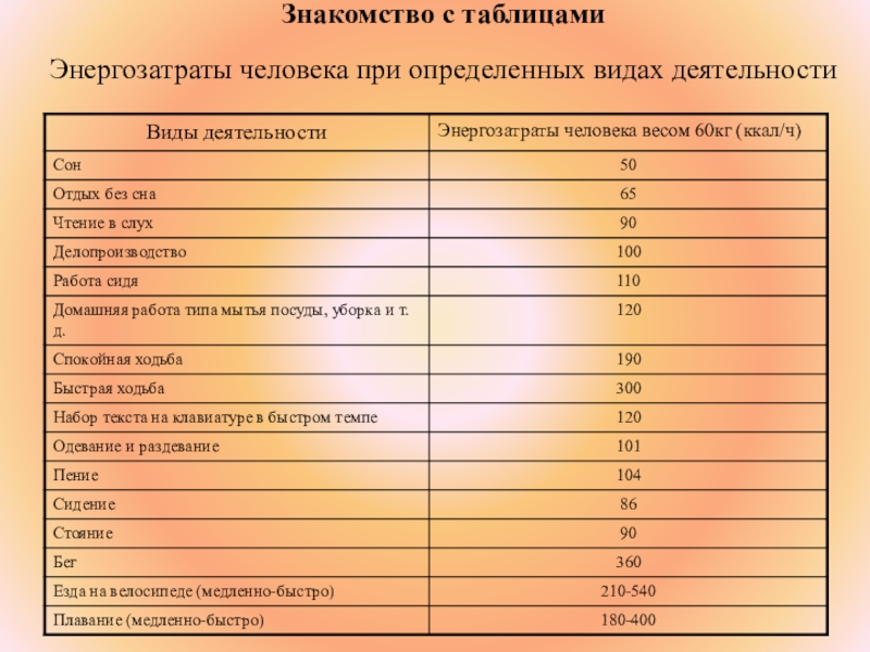 энергозатраты ( в ккал/ч) «стандартного» человека (массой 60 кг) при различных видах деятельности.