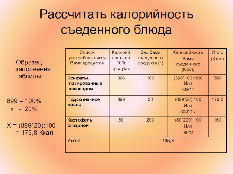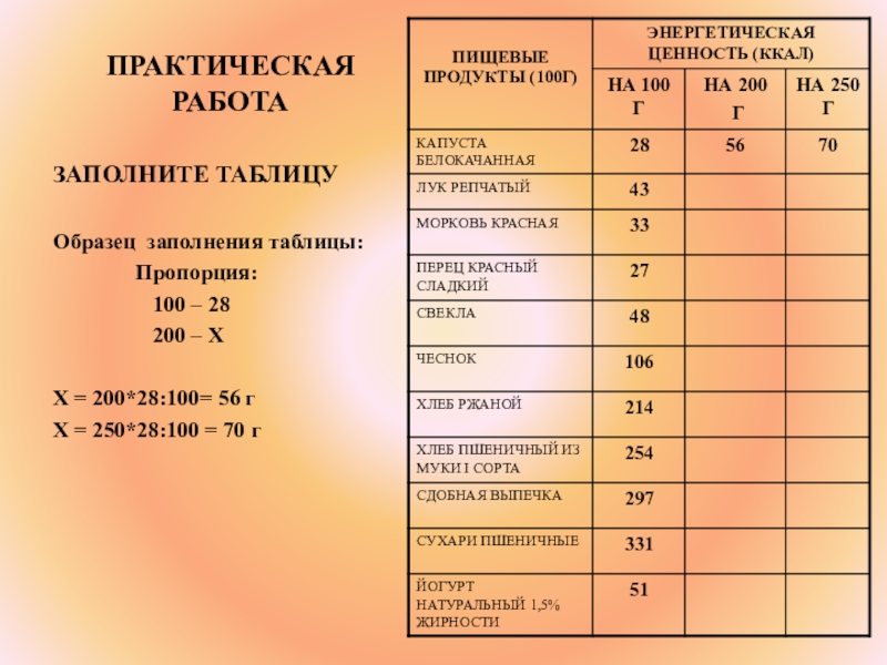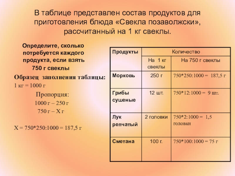 Слайд 43В таблице представлен состав продуктов для приготовления блюда «Свекла позаволжски», рассчитанный
