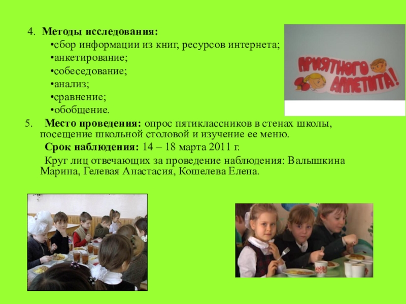 5. Место проведения: опрос пятиклассников в стенах школы, посещение школьной столовой и изучение ее меню.