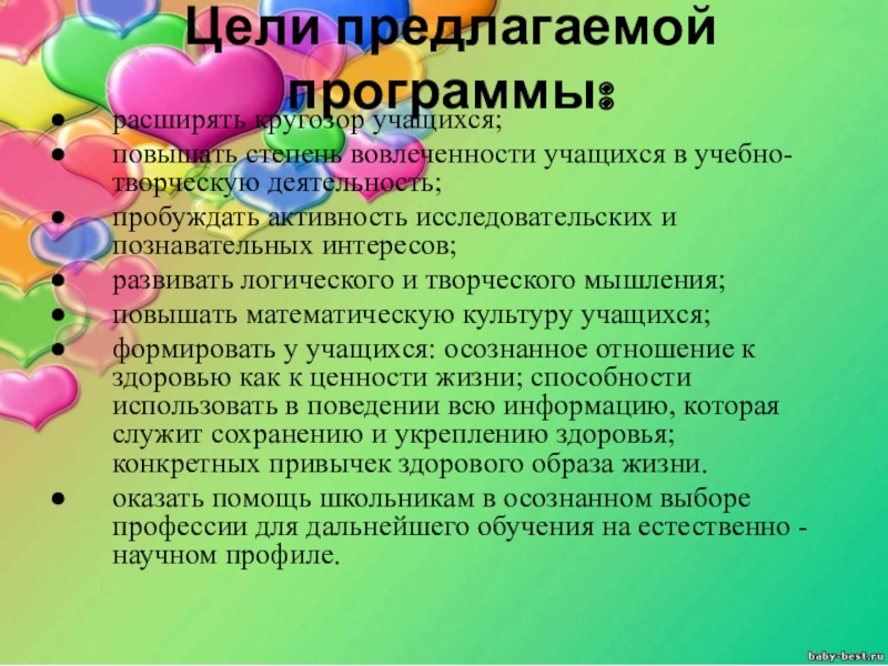 Программа данного курса актуальна в условиях подготовки к осознанному выбору дальнейшего профиля обучения; имеет ориентационную направленность; показывает, что математика в наши дни проникла во все сферы жизни и овладение практически любой профессией требует тех или иных знаний по математике; опирается на знания и умения, полученные школьниками при изучении биологии, физики, химии и т.д.; поддерживает и углубляет знания по этим предметам.
