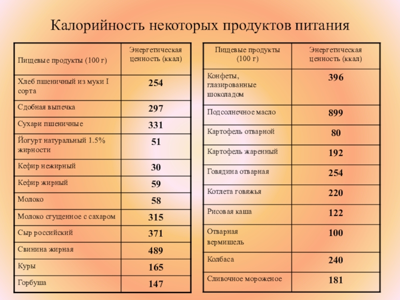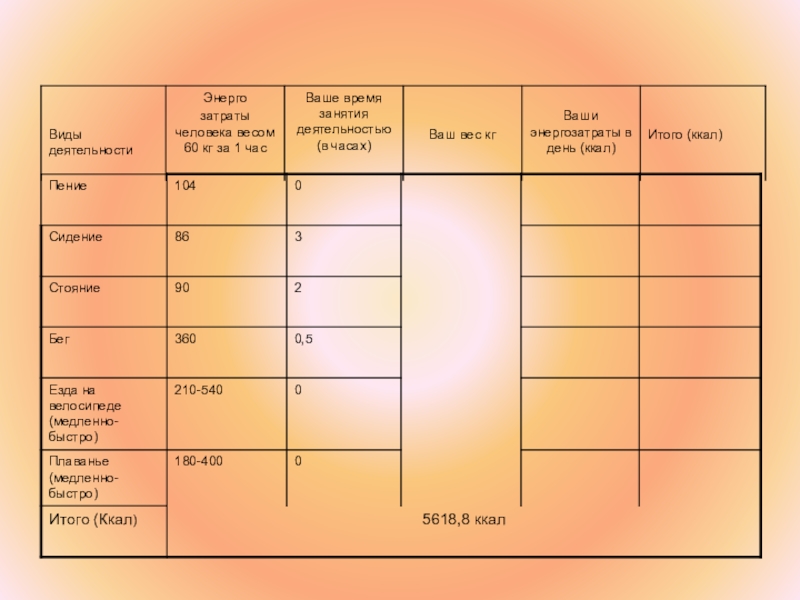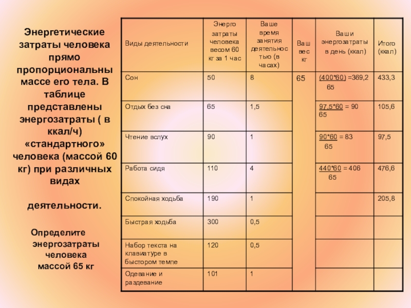 Слайд 41Энергетические затраты человека прямо пропорциональны массе его тела. В таблице представлены