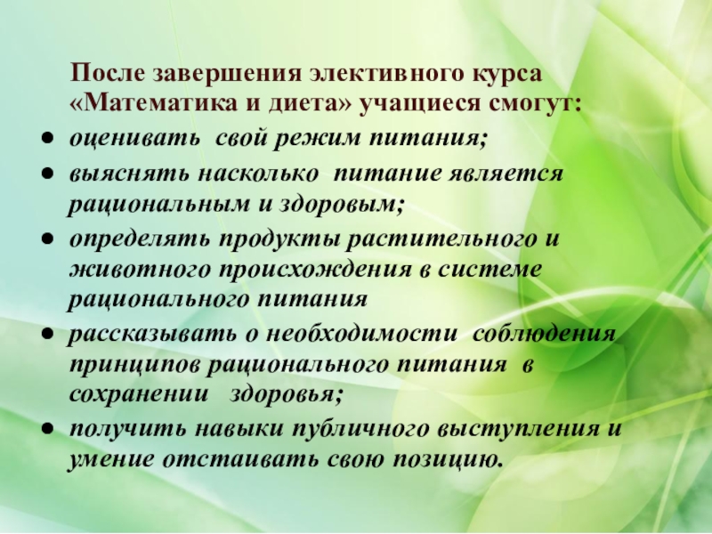 После завершения элективного курса «Математика и диета» учащиеся смогут: