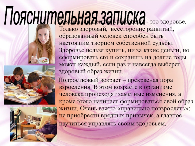 Подростковый возраст – прекрасная пора взросления. В этом возрасте в организме человека происходят заметные изменения, а кроме этого начинает формироваться свой образ жизни. Очень важно «правильно повзрослеть»: не приобрести вредных привычек, а главное - научиться управлять своим здоровьем.