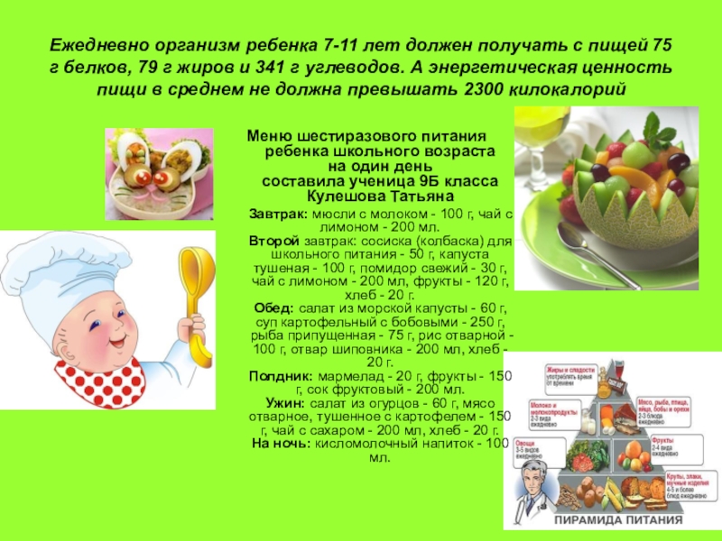 Слайд 46Ежедневно организм ребенка 7-11 лет должен получать с пищей 75 г