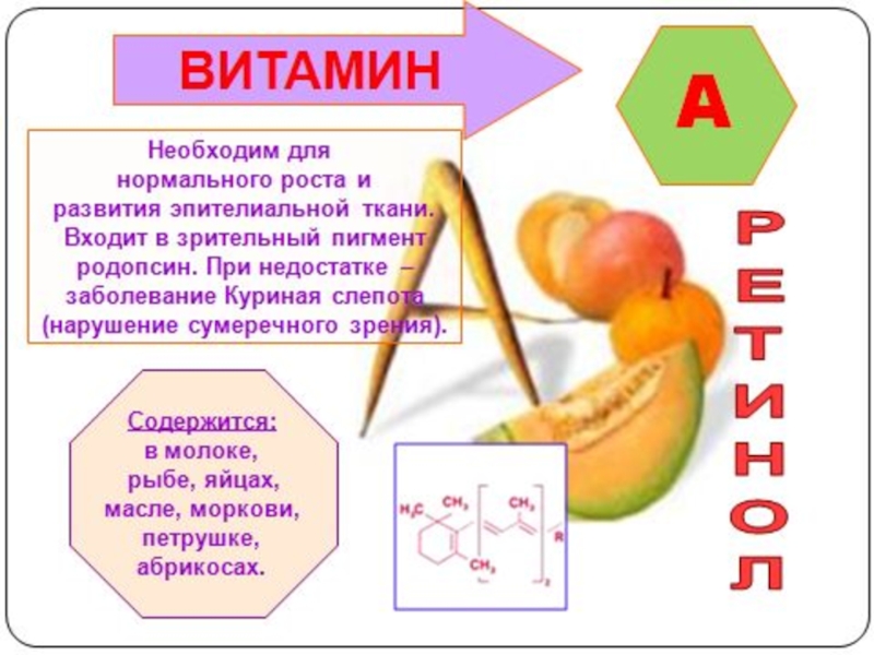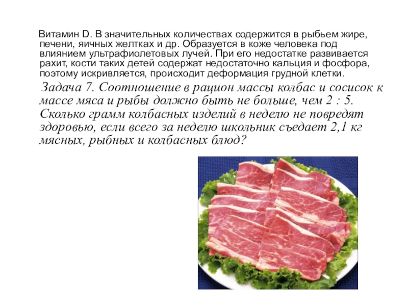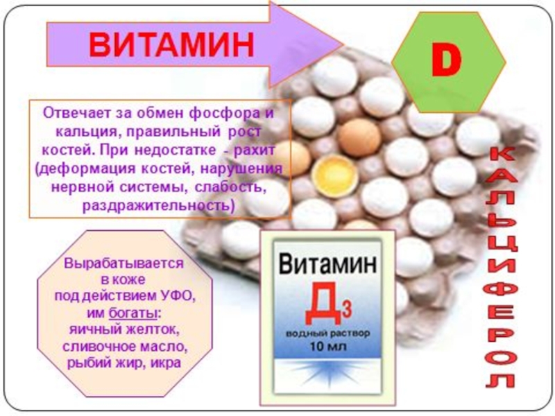 жире, печени, яичных желтках и др. Образуется в коже человека под влиянием ультрафиолетовых лучей. При его недостатке развивается рахит, кости таких детей содержат недостаточно кальция и фосфора, поэтому искривляется, происходит деформация грудной клетки.