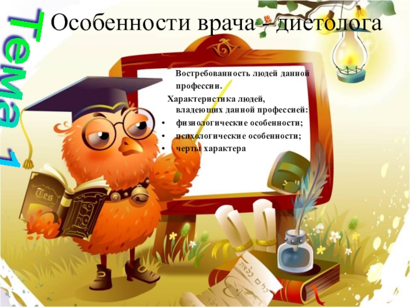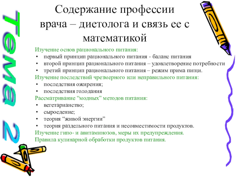 рассматривает такие вопросы, как особенности профессии врача-диетолога, содержание данной профессии и возможности ее реализации, составление режима питания и индивидуальной диеты.