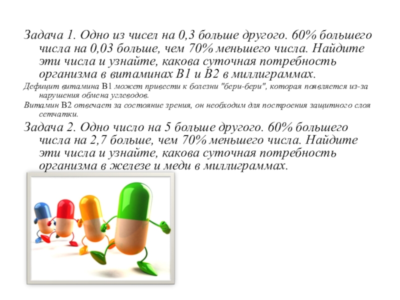 Задача 8. Масса витамина С, ежедневно необходимая человеку, относится к массе витамина Е, как 4 : 1. Какова суточная потребность в витамине Е, если витамина С мы в день должны употреблять 60 мг?