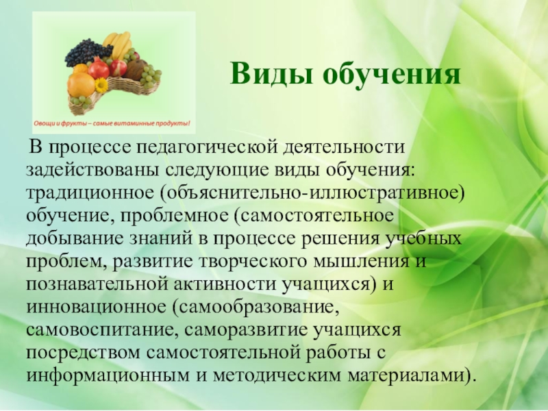 В процессе педагогической деятельности задействованы следующие виды обучения: