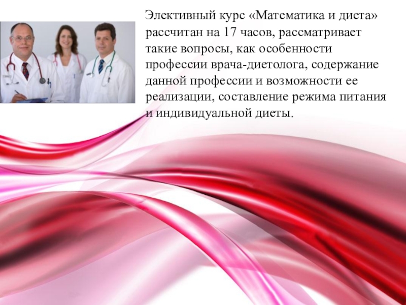 Слайд 4 Элективный курс «Математика и диета» рассчитан на 17 часов,