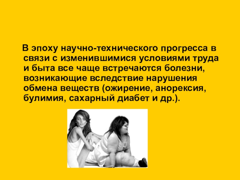 труда и быта все чаще встречаются болезни, возникающие вследствие нарушения обмена веществ (ожирение, анорексия, булимия, сахарный диабет и др.).